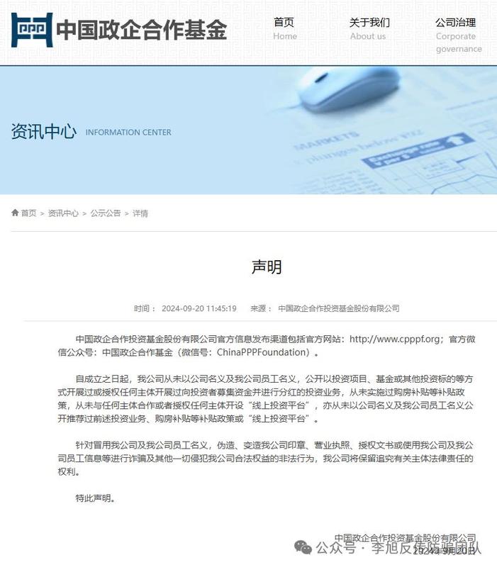 中國政企合作基金官方網(wǎng)站多次發(fā)布過聲明,從未公開以投資項目、基金或其他投資標(biāo)的等方式開展或授權(quán)任何主體開展過向投資者募集資金并進(jìn)行分紅的投資業(yè)務(wù),也從未與任何主體合作或授權(quán)任何主體開設(shè)“線上投資平臺”。
