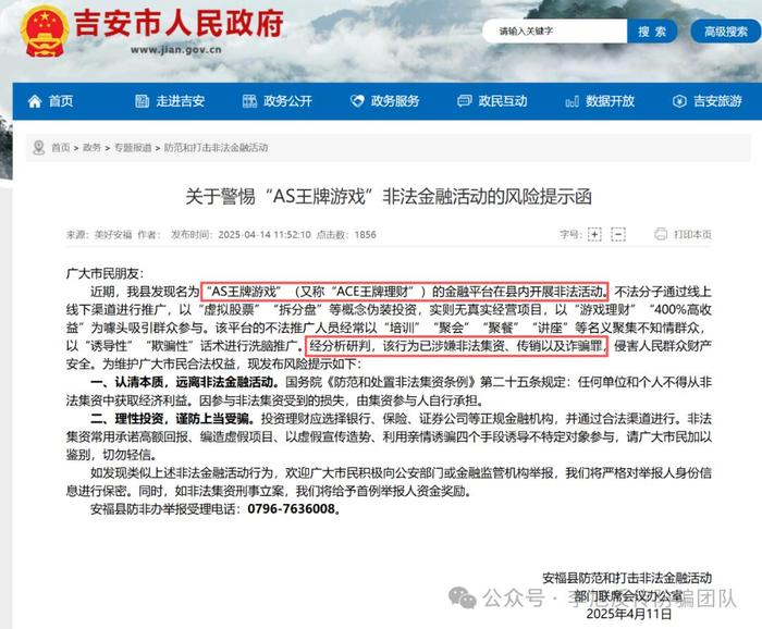 2025年4月,吉安市安??h打非辦發(fā)布《關(guān)于警惕“AS王牌游戲”非法金融活動的風(fēng)險提示》