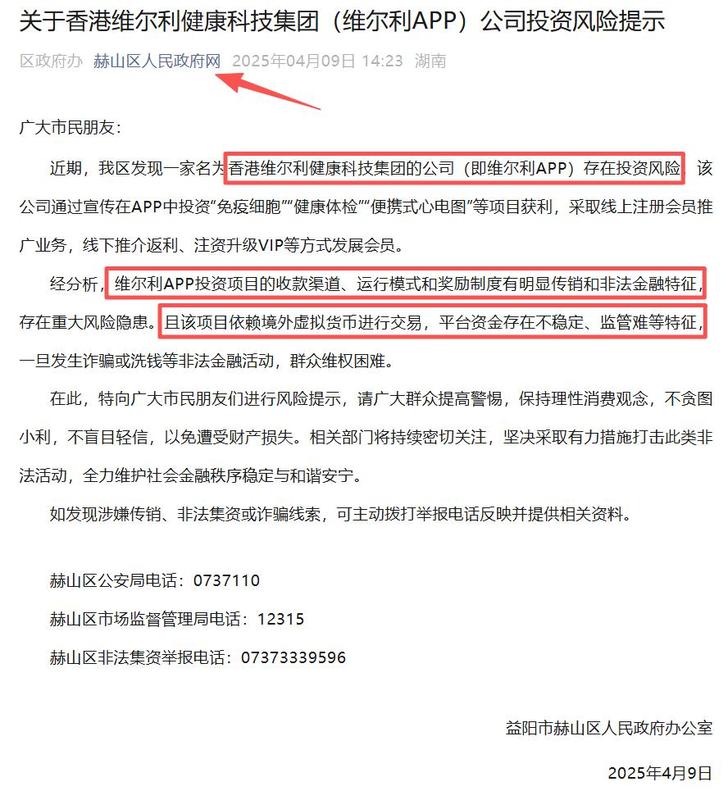 2025年4月,“赫山區(qū)人民政府網(wǎng)”公眾號發(fā)布關(guān)于《香港維爾利健康科技集團(tuán)(維爾利APP)公司投資風(fēng)險提示》)