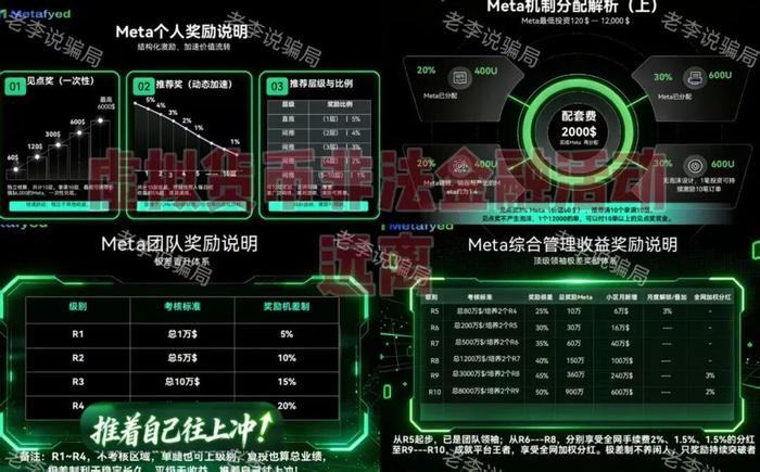 包裝成“RWA資產(chǎn)上鏈”的Web3.0生態(tài)項目,發(fā)行“Meta”、“MetaX”等代幣。參與者需繳納120至12000美元的“算力費”獲得入場資格,號稱可通過MetaX理財獲得36%-90%的年化靜態(tài)收益。
