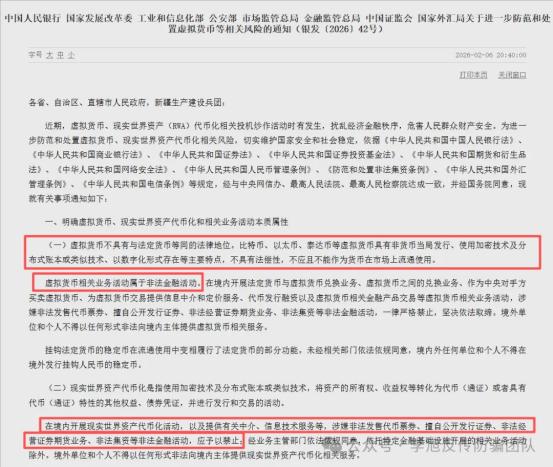 2026年2月6日,央行、證監(jiān)會(huì)等八部門聯(lián)合發(fā)布關(guān)于虛擬貨幣RWA(真實(shí)世界資產(chǎn)代幣化)的重磅通知。