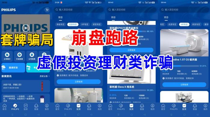 該項(xiàng)目冒充“菲利普”公司的名義,打著“醫(yī)療設(shè)備”推廣的旗號(hào),制作散布涉詐APP,虛構(gòu)推廣“菲利浦病人監(jiān)護(hù)儀”“菲利浦CS磁共振成像系統(tǒng)”“菲利浦EPIQ7C超聲診斷儀”“菲利浦ElevaX線系統(tǒng)”等高額返利理財(cái)項(xiàng)目,最后跑路之前,推出小時(shí)利率,瘋狂收割參與者。