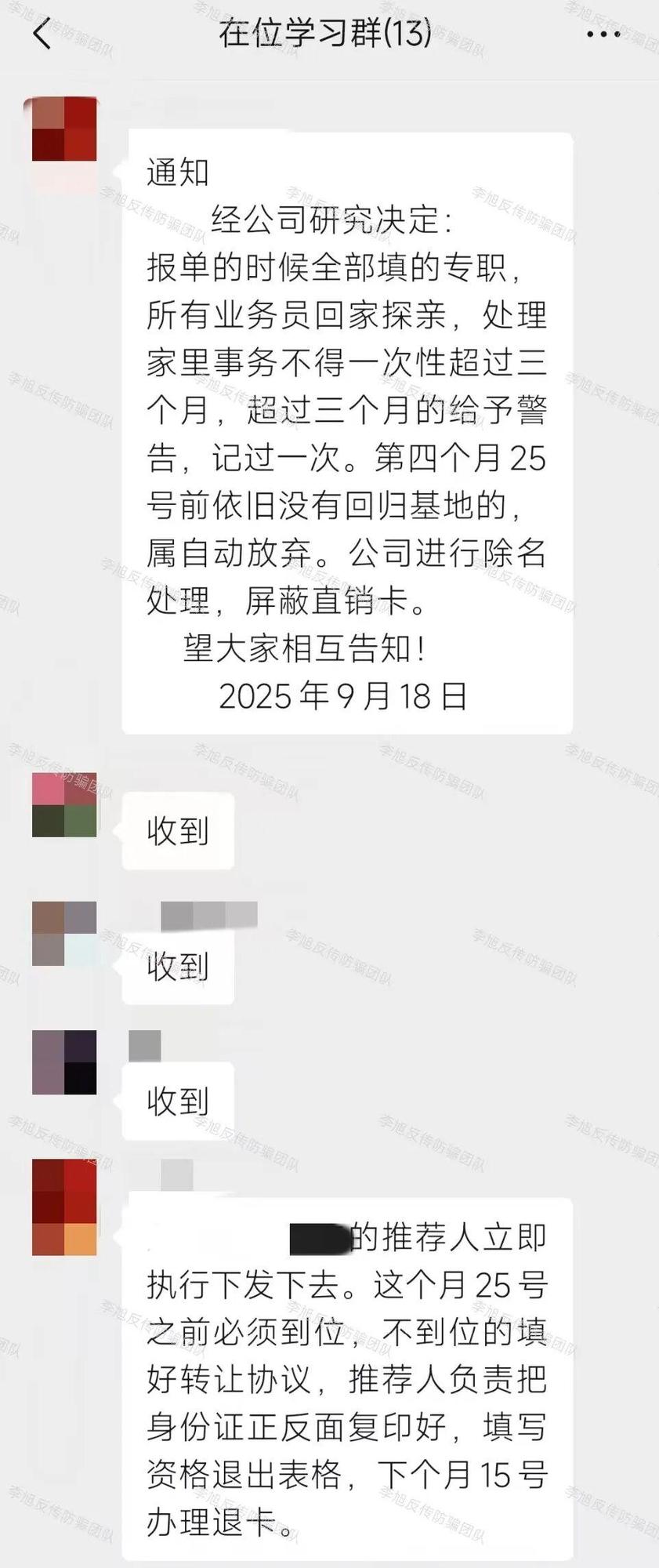 綿陽這邊的傳銷團(tuán)伙也已轉(zhuǎn)入地下,解散大群改用小群秘密運(yùn)作,以孟總、李總為頭目,發(fā)布嚴(yán)苛管控通知:業(yè)務(wù)員回家不能超過三個(gè)月,逾期就警告、記過,超過四個(gè)月直接除名、屏蔽直銷卡。