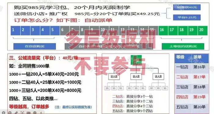 以“985元學(xué)習(xí)包”為幌子,將繳費(fèi)與加入資格、派單權(quán)直接綁定。它把985元拆成20個(gè)49.25元的訂單,設(shè)計(jì)了“一鉆到五鉆”的等級,說只要拉人升級,就能按等級自動派單、拿“公域流量獎(jiǎng)”,等級越高賺得越多。