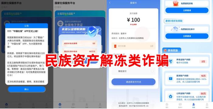 不法分子冒充“社保局”的名義,制作散布涉詐APP,聲稱民政部、財(cái)政部下?lián)堋?320億社保補(bǔ)助金”,參與者實(shí)名注冊(cè)即可領(lǐng)取88萬“社保補(bǔ)助金”、10萬醫(yī)保賬戶、50萬公積金賬戶,繳納費(fèi)用可激活醫(yī)保卡,邀請(qǐng)他人注冊(cè)可領(lǐng)取養(yǎng)老金、醫(yī)保金、公積金等。