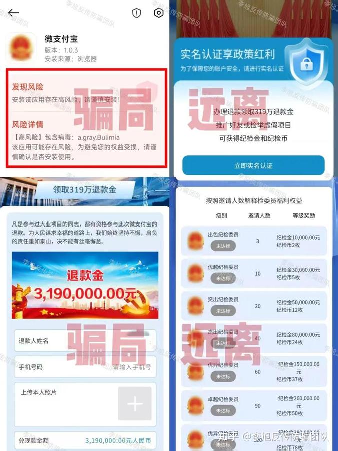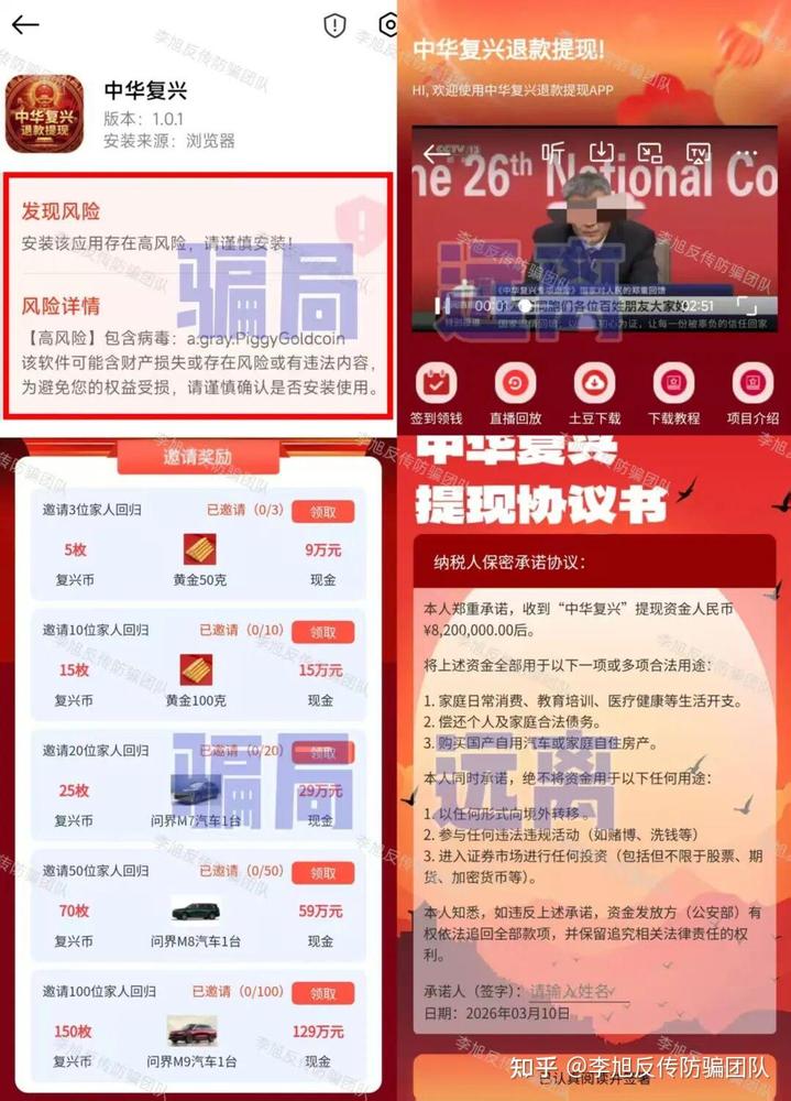 冒充“國家項目”,說參與者只要提交身份證號、銀行卡號等詳細個人身份信息完成實名,再簽署所謂的“提現(xiàn)協(xié)議書”,就可以領(lǐng)取820萬資金。同時,還拿黃金、豪車、現(xiàn)金、復興幣等極具誘惑力的獎勵作為誘餌,促使參與者積極邀請新人加入。