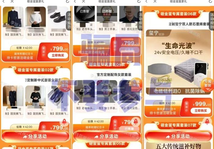 更是借著“支持國貨”的旗號,讓參與者在某指定電商平臺高價購買指定商品,從最初的短袖到現(xiàn)在的手表、中山裝,聲稱集齊所謂的“五福卡”,就能獲得高額分紅。