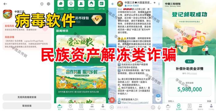 不法分子冒充國家某機構的名義,打著“助農、扶貧”等旗號,制作散布涉詐APP,聲稱為追夢人發(fā)放補償款,參與者注冊即可領取10萬三農錢包,實名注冊可領取598萬補償補助金,發(fā)展下線可領取更多獎勵。