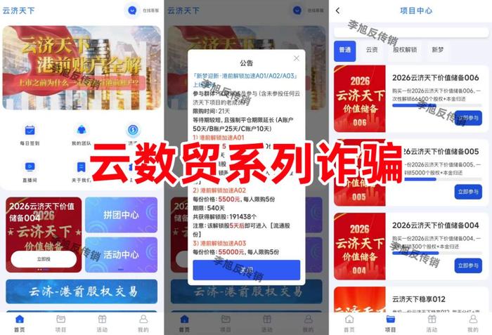 不法分子打著傳銷組織“云數貿”的旗號,聲稱公司發(fā)起人是“張健”,打著公司上市的旗號,制作散布涉詐APP,虛構推廣“云濟天下價值儲備”“股權”等高額返利項目。