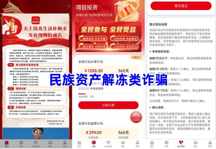 不法分子冒充“人力資源社會保障部”的名義,打著“健全社會保障體系”的旗號,聲稱參與者實名注冊可領取生活補助金,邀請他人注冊也可獲得補助金,同時虛構推廣“眾享計劃”“益享計劃”等高額返利理財項目。