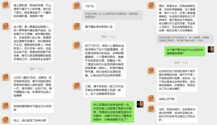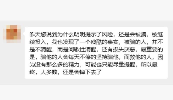 發(fā)表時(shí)間:2026-03-26 17:37作者:李旭反傳銷來源:李旭反傳防騙團(tuán)隊(duì) 為什么有些人,已經(jīng)明確告知她是詐騙,還是會(huì)被騙? ![]() 今天這篇文章,如果你還沒有被騙過,就一定要看! 我們通過和受害者的真實(shí)對(duì)話,完整拆解被騙者的內(nèi)心的心路歷程 看完之后,你絕對(duì)會(huì)對(duì)電詐分子的套路,有顛覆性的全新認(rèn)知。 ![]() 先簡單捋一下這位受害者的被騙經(jīng)過。 去年上半年,在一個(gè)相親群里結(jié)識(shí)了一名男士,對(duì)方自稱從事物流行業(yè),并不是那種不切實(shí)際的完美高富帥人設(shè)。 (這里重點(diǎn)說明以下,這位受害者本身是具備反詐意識(shí)的,平時(shí)經(jīng)常關(guān)注殺豬盤相關(guān)的新聞報(bào)道,之前也憑借警惕心,成功避開過好幾個(gè)人設(shè)完美、套路明顯的騙局,防范意識(shí)其實(shí)比很多人都要強(qiáng)。) 而這位騙子恰恰抓住了這一點(diǎn),偽裝得格外真實(shí):用的是真人頭像,說話風(fēng)格特別接地氣,沒有半點(diǎn)浮夸做作。兩人慢慢聊得十分投緣,日常會(huì)分享生活里的瑣碎小事,訴說生活中的酸甜苦辣,甚至能視頻通話,還主動(dòng)發(fā)過身份證照片,時(shí)不時(shí)提起自己的母親,把自己塑造成一個(gè)孝順父母、踏實(shí)上進(jìn)的普通人,逐漸打消了受害者的戒備心。 ![]() △受害者講述被騙的詳細(xì)經(jīng)過 就這樣平穩(wěn)聊了兩三個(gè)月,對(duì)方開始不動(dòng)聲色地鋪墊話題,說物流行業(yè)行情不好,想多找些門路賺點(diǎn)錢,還提到家里大伯準(zhǔn)備給他介紹一些靠譜的互聯(lián)網(wǎng)項(xiàng)目,自己正在慢慢了解。過了一段時(shí)間,他說已經(jīng)開始跟著大伯開始做這個(gè)項(xiàng)目,又過了一陣子,他表示自己試投了一段時(shí)間,收益很可觀,詢問受害者要不要一起參與。 剛開始,受害者明確表示不感興趣,對(duì)方也沒有強(qiáng)行勸說,只是輕描淡寫把她拉進(jìn)了一個(gè)幾十人的小群(群內(nèi)基本都是托),說他們是一個(gè)商會(huì)的,群里都是志同道合的朋友,大家一起交流學(xué)習(xí)、傳遞正能量。這個(gè)群里沒有激進(jìn)的投資宣傳,也沒有瘋狂的洗腦話術(shù),大家每天就是分享日常、偶爾發(fā)發(fā)紅包,氛圍格外融洽,久而久之,受害者真的把群里的人當(dāng)成了真實(shí)可信的朋友。 在這樣的氛圍熏陶下,她慢慢放下了最后的顧慮,開始嘗試小額投資,沒想到前期投入的本金和盈利,都能順利提現(xiàn)(為了讓受害者加大投入,現(xiàn)在很多騙局都會(huì)先撒點(diǎn)魚餌)。正是這種真實(shí)的“回款”,讓她徹底放松了警惕,開始一步步加大投入,到最后甚至為了跟進(jìn)項(xiàng)目,選擇貸款投錢。最終無法提現(xiàn),關(guān)網(wǎng)跑路,留下獨(dú)自一人傻眼的她。 那么問題來了:一個(gè)本身有反詐意識(shí)、還躲過同類騙局的人,為什么最終還是沒能逃過電詐陷阱? 我不知道大家有沒有聽過這樣一句話:你暫時(shí)沒有被騙,不是因?yàn)槟阕銐蚵斆鳎沁m合你的劇本,還沒有出現(xiàn)。一旦騙子開始量身定制劇本,每個(gè)人都無法躲過被騙! ![]() △與受害者的聊天截圖 這位受害者確實(shí)掌握了基礎(chǔ)反詐知識(shí),但電詐分子的騙術(shù)從來不是千篇一律的模板,他們會(huì)精準(zhǔn)剖析每個(gè)受害者的特性,打造毫無破綻的騙局。 針對(duì)她的這個(gè)劇本,騙子全程走親民路線,貼近真實(shí)生活,言行舉止處處透著真誠,既尊重她的想法,又能和她深度共情,還打著帶她一起賺錢成長的旗號(hào)帶她進(jìn)入他們的圈子,甚至連他們口中的投資項(xiàng)目,都是假冒正規(guī)、網(wǎng)上可查信息的公司,用層層偽裝磨掉了她所有的警惕心,這也是她最終沒能躲過的核心原因。 受害者自己也感慨說,騙子真的太會(huì)利用人性,哪怕到后期自己已經(jīng)隱約察覺到這是騙局,還是會(huì)不由自主按照騙子的說法去做,總抱著一絲僥幸心理。 ![]() 而她最后說的一番話,更是讓我們瞬間頓悟。她說,其實(shí)被騙的人,并不是一直都不清醒,而是間歇性清醒,心里清楚有風(fēng)險(xiǎn),卻又放不下已經(jīng)投入的錢財(cái),陷入損失厭惡的心理怪圈;最關(guān)鍵的是,騙子會(huì)每天不間斷、堅(jiān)持不懈地實(shí)施洗腦和詐騙,步步緊逼、不停拉扯;可想要提醒她、拉她走出陷阱的人,沒有那么多時(shí)間和精力反復(fù)勸說,往往只能盡力提醒幾句。也正是這樣的力量差距,最終讓大多數(shù)心存僥幸的人,還是徹底掉進(jìn)了騙子的圈套。 最后也想借著這個(gè)真實(shí)案例提醒大家,哪怕你具備一定的反詐意識(shí),也千萬不要掉以輕心。網(wǎng)戀交友涉及投資理財(cái)、陌生平臺(tái)誘導(dǎo)充值、以高額回報(bào)為誘餌的項(xiàng)目,一律要提高十二分警惕,守住自己的錢袋子,才是對(duì)自己和家人最負(fù)責(zé)的保障。 另外,這位參與者所參與的項(xiàng)目是假冒“亞丁集團(tuán)”的虛假投資理財(cái)平臺(tái),針對(duì)此類騙局,識(shí)別方法就三招,只要是符合這些特點(diǎn),不管騙子包裝的多么完美,都不要相信。 【特別聲明:本文為反詐科普,旨在提高公眾防范意識(shí),內(nèi)容根據(jù)網(wǎng)友真實(shí)經(jīng)歷編輯而成,此內(nèi)容不構(gòu)成對(duì)任何正規(guī)企業(yè)商