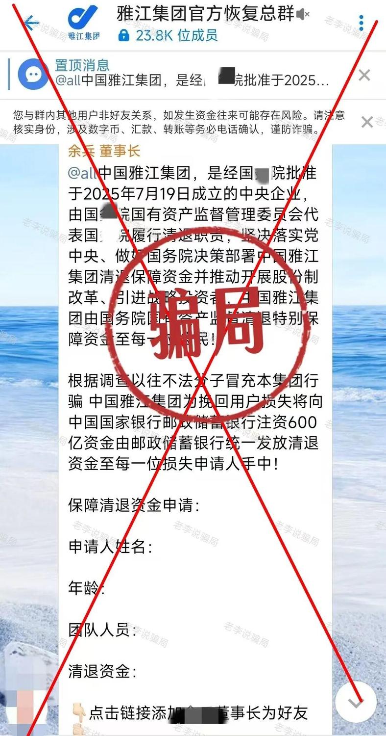 如今,不法分子開始“賊喊抓賊”,打著“清退”名義,冒充“雅江集團”,謊稱為參與“雅江”系列騙局遭受損失的人發(fā)放清退金。