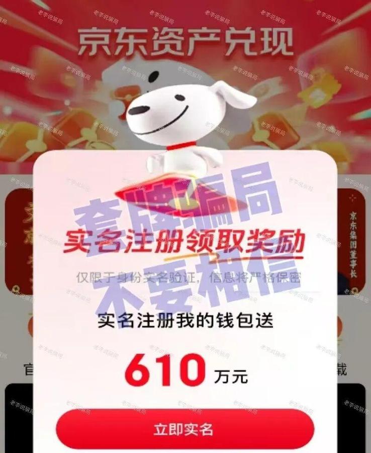 冒充“京東”公司的名義,聲稱公司將發(fā)放專項兌現(xiàn)資金,用于改善生活,養(yǎng)老防老,參與者實名注冊,提供個人信息,即可獲得610萬元的專項兌現(xiàn)金。如此離譜的高額資金承諾,本身就是騙局的明顯特征。