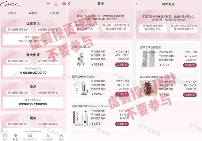 平臺將各種美容醫(yī)療器械包裝成理財項目,打著“云租機”的旗號,設(shè)置投資金額、周期和收益率。設(shè)置多個層級,按照等級發(fā)放團隊獎勵。