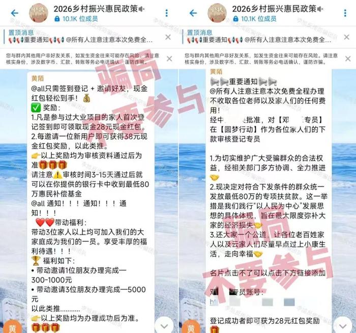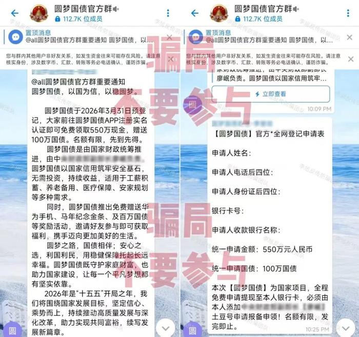 發(fā)表時(shí)間:2026-04-01 18:30作者:李旭反傳銷來源:李旭反傳防騙團(tuán)隊(duì) 不知道大家有沒有一種感覺,好像每次打開手機(jī),整個(gè)世界都在向你招手。 一會(huì)兒是國(guó)家要發(fā)錢了,一會(huì)兒是政策紅利來了,這些來自親朋好友“極力推薦”的“好機(jī)會(huì)”都帶著一種讓人無法拒絕的“官方感”和“緊迫感”,好像只要相信它,再動(dòng)動(dòng)手指,就能抓住改變命運(yùn)的機(jī)會(huì)。 但是,越是這個(gè)時(shí)候,我們?cè)叫枰潇o下來想一想:為什么那些動(dòng)輒幾十萬、幾百萬的“好事”,會(huì)像大海撈針一樣,這么精準(zhǔn)地砸在我們頭上?為什么那些所謂的“國(guó)家項(xiàng)目”,不通過正規(guī)的銀行或政府窗口辦理,反而要在一個(gè)來路不明的APP里,催著我們填身份證、填銀行卡? 這就好比,大家走在路上,突然有人塞給你一張彩票,告訴你中了五百萬,但前提是得先交一筆“手續(xù)費(fèi)”或者“公證費(fèi)”。沒人會(huì)相信對(duì)吧?可是把它放在網(wǎng)絡(luò)上,再標(biāo)榜幾個(gè)高大上的背景,立馬就有人趨之若鶩。你看,這就是騙局的“高明”之處。 今天我們又梳理了近期出現(xiàn)的一些典型套路,它們有的剛剛“冒頭”,有的已經(jīng)接近尾聲。希望大家看完,也能發(fā)給身邊人提個(gè)醒,愿我們都能遠(yuǎn)離騙局。 1、“圓夢(mèng)國(guó)債” 昨天剛剛出現(xiàn)的新項(xiàng)目,打著“免費(fèi)領(lǐng)取550萬國(guó)債”的旗號(hào)吸引人。號(hào)稱APP將于4月3日上線,目前正在利用“預(yù)登記”的名義收集參與者的個(gè)人信息。 這里給大家提個(gè)醒:正規(guī)的國(guó)債,無論是儲(chǔ)蓄國(guó)債還是記賬式國(guó)債,都是通過銀行柜臺(tái)、證券公司這些官方渠道公開發(fā)行和購(gòu)買的,絕對(duì)不會(huì)通過某個(gè)社交軟件,以個(gè)人私下邀請(qǐng)、贈(zèng)與的方式進(jìn)行。天上不會(huì)掉餡餅,更不會(huì)掉下百萬國(guó)債,這明顯是沖著您的個(gè)人信息來的,請(qǐng)務(wù)必遠(yuǎn)離。 ![]() 2、“海南發(fā)展”APP 蹭“海南自貿(mào)港”政策熱點(diǎn)出現(xiàn),用免費(fèi)安居房、股票、消費(fèi)卡做誘餌,目的就是套取大家詳細(xì)的身份證、住址、銀行卡信息。 ![]() ![]() 為了讓人相信,群里還會(huì)曬出一些所謂“工作人員”的證件,但仔細(xì)看就能發(fā)現(xiàn)PS痕跡非常明顯。 更何況這個(gè)項(xiàng)目的APP下載鏈接來路不明,安裝時(shí)提示“未備案”,服務(wù)器地址也在境外,根本不可信。 除了這個(gè)項(xiàng)目,近期還有不少蹭同一熱點(diǎn)政策出現(xiàn)的虛假網(wǎng)絡(luò)項(xiàng)目,例如:套牌的“海南銀行”、“海南自貿(mào)港”、“海易辦”等等。 ![]() 大家一定要認(rèn)準(zhǔn)官方渠道,不要點(diǎn)擊任何陌生鏈接下載應(yīng)用。 警惕利用“海南封關(guān)政策”新騙局!雙戶籍+房產(chǎn)+500萬?醒醒吧! 3、“中國(guó)雄安養(yǎng)老” 冒充公職人員,利用大家對(duì)雄安新區(qū)發(fā)展的關(guān)注,打著為參與者申請(qǐng)房產(chǎn)的名義收集用戶詳細(xì)個(gè)人身份信息。 類似蹭“雄安”熱點(diǎn)的網(wǎng)絡(luò)騙局層出不窮,比如“雄安兌現(xiàn)2026”APP、“雄安新區(qū)資產(chǎn)兌現(xiàn)”APP、“雄安計(jì)劃”APP、“圓夢(mèng)雄安”APP、“雄安銀行”APP、“雄安人民資產(chǎn)”APP、“千年雄安2026”等等。 任何重大政策的紅利發(fā)放,都有嚴(yán)格、公開的程序,不會(huì)由某個(gè)個(gè)人在網(wǎng)上私下聯(lián)系您辦理,遇到讓您填詳細(xì)資料的所謂“內(nèi)部渠道”,一定要多打個(gè)問號(hào)。 ![]() 4、元某先鋒 將普通的水包裝成嗲有保健功能的水,以虛高價(jià)格進(jìn)行出售。用戶交押金成為代理,然后靠賣貨、拉人頭、組建團(tuán)隊(duì)賺錢。 該項(xiàng)目自去年八月無法提現(xiàn)后,曾用“股票”、“U卡”等說發(fā)試圖繼續(xù)拖延,但最終都無法兌現(xiàn)。 目前,多地的工作室已經(jīng)人去樓空。如果您或家人曾參與其中,請(qǐng)盡快整理好轉(zhuǎn)賬記錄、聊天記錄等相關(guān)證據(jù),向當(dāng)?shù)厥袌?chǎng)監(jiān)管部門或公安機(jī)關(guān)舉報(bào)維權(quán)。 5、“未來中國(guó)”APP 謊稱“國(guó)家項(xiàng)目”,以發(fā)放329萬元“專項(xiàng)資金”為誘餌,吸引參與者進(jìn)行實(shí)名認(rèn)證,并要求填寫銀行卡號(hào)、開戶行、身份證等極度敏感的信息。 同樣利用“拉人頭”機(jī)制,宣稱邀請(qǐng)新人可以獲得額外的“養(yǎng)老補(bǔ)貼”、“醫(yī)療補(bǔ)貼”等,這正是抓住了中老年朋友對(duì)未來保障的關(guān)切心理實(shí)施精準(zhǔn)詐騙。 請(qǐng)千萬記住,沒有任何國(guó)家項(xiàng)目會(huì)以這種方式在網(wǎng)絡(luò)上向個(gè)人募集信息、發(fā)放巨額資金。保護(hù)好自己的銀行卡和身份證信息,就是保護(hù)好自己的養(yǎng)老錢。 6、LAE低空經(jīng)濟(jì) 低空經(jīng)濟(jì)是國(guó)家大力扶持的新興產(chǎn)業(yè),但也被一些騙局當(dāng)成了幌子。 這個(gè)項(xiàng)目將各種無人機(jī)包裝成理財(cái)產(chǎn)品,承諾的年化收益高得離譜。但根據(jù)行業(yè)內(nèi)普遍情況,正規(guī)的低空經(jīng)濟(jì)項(xiàng)目,年化收益通常不會(huì)超過6%