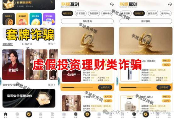 “聯(lián)娛互創(chuàng)”APP:冒充香港影視投資公司,虛構(gòu)“影視投資”、“日常百貨”采購等理財項目。