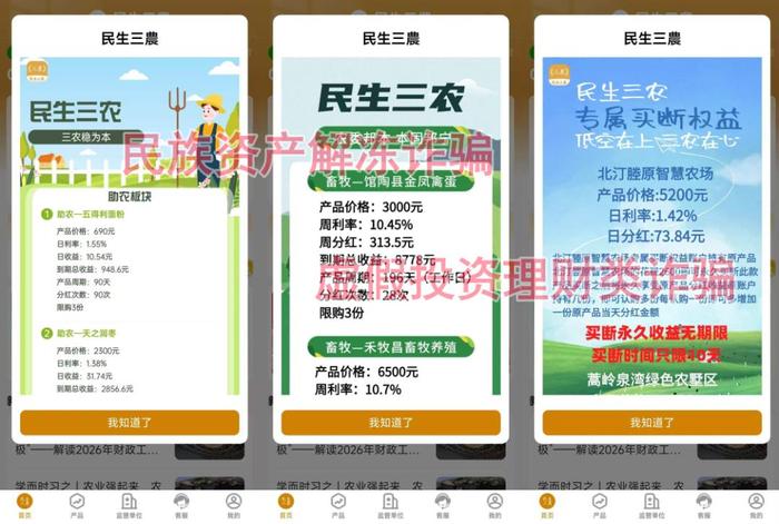 不法分子打著“提振三農”“智慧農業(yè)”等旗號,制作散布涉詐APP,虛構推廣“鄉(xiāng)村振興成長基金”“農場”“畜牧”“助農”等高額返利理財項目,采用傳銷模式發(fā)展下載,收款賬戶為個人、第三方公司,軟件未經(jīng)過ICP備案,涉嫌傳銷、詐騙。