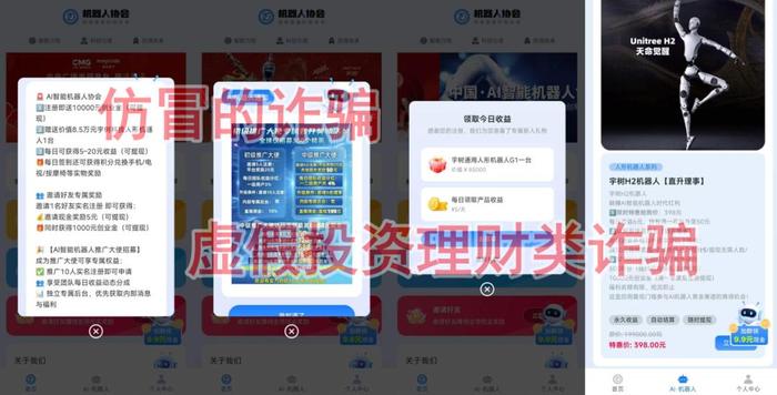 不法分子冒充“機器人協(xié)會”的名義,制作散布涉詐APP,聲稱參與者實名注冊即可領取一臺宇樹GI人性機器人,1萬元創(chuàng)業(yè)金,邀請他人參與,可領取創(chuàng)業(yè)金、現(xiàn)金紅包、動態(tài)收益等,同時虛構機器人理財項目。