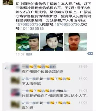隨后,阿平的姐姐試圖在朋友圈尋人。有人留言說(shuō)在廣州塔附近有線索,阿平姐姐即刻由清遠(yuǎn)老家趕來(lái)廣州,并去到廣州塔附近的赤崗派出所報(bào)警。