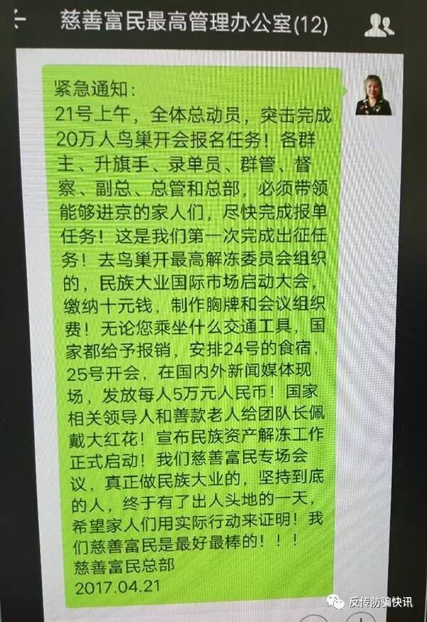 4月21日開始,陳玉英開始在其組織的微信群中發(fā)布消息稱4月24日、25日在北京鳥巢將舉行“民族資產(chǎn)解凍啟動儀式”,到場人員將每人發(fā)放5萬元現(xiàn)金,但參加人員每人要繳納10元的報名費。她在微信群內(nèi)還鼓吹:“我們慈善富民專場會議,真正做民族大業(yè)的,堅持到底的人,終于有了出人頭地的一天,希望家人們用實際行動來證明?!?/p>