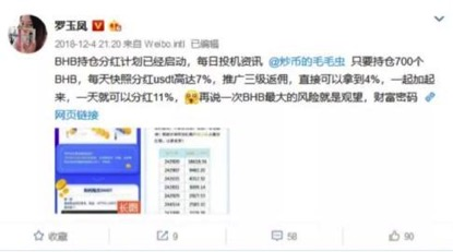 每天持有700個BHB,每天快照分紅USDT7%,推廣三級返傭,再加4%,一天加起來可得到11%收益。這種傳銷式的空氣幣推廣語,是不是很熟悉?盡管人已遠在大洋彼岸的“勵志網(wǎng)紅”羅玉鳳,其微博已經(jīng)不像以前那么受人關(guān)注,但是也沒有人會預料到,被號稱“鳳姐”名頭的她,在2018年開始投身虛擬數(shù)字貨幣圈,并且在歲末年初的時候為那些空氣幣進行微博代言,其搖旗吶喊的瘋狂態(tài)勢令人側(cè)目。