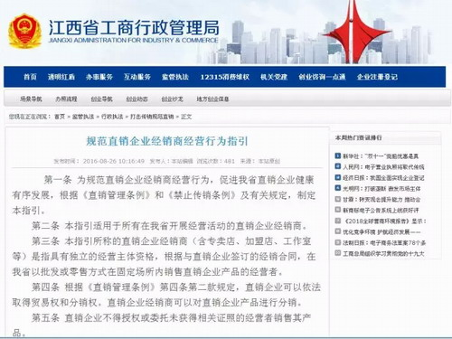 2016年8月26日,江西省工商行政管理局官網(wǎng)發(fā)布《規(guī)范直銷企業(yè)經(jīng)銷商經(jīng)營行為指引》,該文件對經(jīng)銷商及經(jīng)銷商的職責進行了明確的界定。