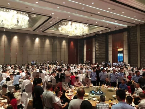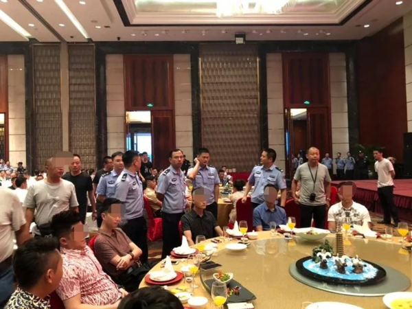這時(shí),先期到達(dá)的偵查民警反饋信息,該團(tuán)伙在酒店二樓大廳聚會(huì),共31桌,約300余人,是專門為二名剛剛升級(jí)為5星的團(tuán)伙成員過生日而舉辦的。為確保行動(dòng)萬(wàn)無(wú)一失,警方又調(diào)集巡特警及前黃、禮嘉、牛塘三個(gè)派出所的部分警力前來(lái)支援。