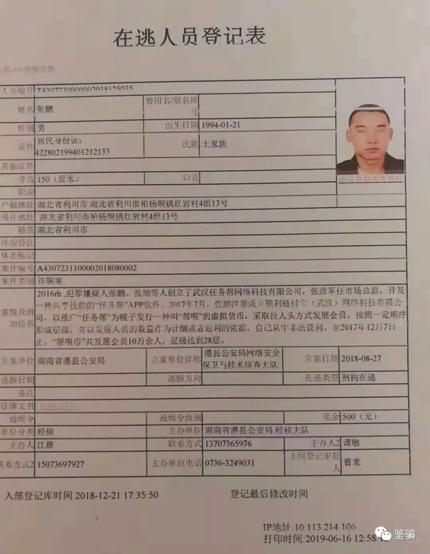 發(fā)表時間:2019-07-29 11:06作者:鑒騙來源:鑒騙 近日,網(wǎng)上出現(xiàn)一張《在逃人員登記表》。該登記表上顯示,被通緝追逃的是湖北省利川市柏楊壩鎮(zhèn)的張鵬,入部登記庫時間是2018年12月21日。而張鵬就是“任務(wù)幫”的操盤手。
