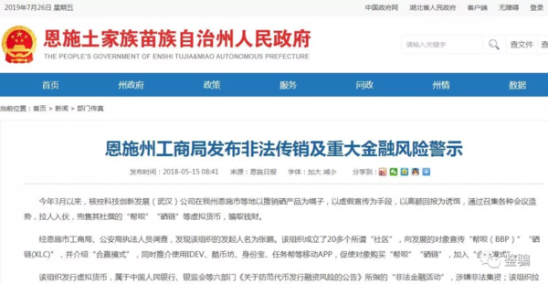 該登記表上還顯示,2016年 ,犯罪嫌疑人張鵬、張旭等人創(chuàng)立了武漢任務(wù)幫網(wǎng)絡(luò)科技有限公司, 張彥軍任市場總監(jiān),開發(fā)一種共享技能的“任務(wù)幫"APP軟件。 2017年7月, 張鵬注冊成立碩利鏈付寶(武漢)網(wǎng)絡(luò)科技有限公司,以推廣“任務(wù)幫”為幌子發(fā)行一種叫”幫唄”的虛擬貨幣,采取拉人頭方式發(fā)展會員,按照一定順序形成層級,并以發(fā)展人員的數(shù)量作為計酬或者返利的依據(jù),自己從中非法獲利。至2017年12月7日止,“幫唄幣”共發(fā)展會員10萬余人,層級達到28層。 值得注意的是,該案是湖南省澧縣公安局在2018年8月27日立案的。鑒騙了解到,2017年8月以來,澧縣籍人向某以投資武漢碩利科技有限公司“幫唄”幣(虛擬貨幣)的名義,用高額回報為誘餌,以發(fā)展人頭來獲利,采取以投資3000元至100000元不同金額,注冊成為武漢碩利科技有限公司“幫唄”幣相對應(yīng)的投資級別會員,用直推或間接推薦其他人成為“幫唄”幣投資會員的方式,獲得幫唄(TBC)靜態(tài)和幫唄(TBC)動態(tài)獎勵。 向某于2017年8月投資40000元,注冊成為武漢碩利科技有限公司“幫唄”幣投資會員,當(dāng)時購買的“幫唄”幣價格為8.80元/枚,到2018年4月9日案發(fā)時,“幫唄”幣的價格上漲為505.00元/枚。與此同時,向某在澧縣采取上述運作模式,直接發(fā)展丁某、劉某、冉某、孫某成為“幫唄”幣投資會員,丁某又發(fā)展盛某、黃某、湯某成為“幫唄”幣投資會員,到案發(fā)時止,當(dāng)事人總共非法獲利100000元。 向某的上述行為屬于《禁止傳銷條例》所指的傳銷違法行為,澧縣食品藥品工商質(zhì)量監(jiān)督管理局依據(jù)《禁止傳銷條例》的規(guī)定對向某作出沒收違法所得10萬元,并處罰款25萬元的行政處罰。 2018年4月23日,恩施州工商局發(fā)布了一份非法傳銷及重大金融風(fēng)險警示。該重大金融風(fēng)險警示稱,今年3月以來,核控科技創(chuàng)新發(fā)展(武漢)公司在我州恩施市等地以推銷硒產(chǎn)品為幌子,以虛假宣傳為手段,以高額回報為誘餌,通過召集各種會議造勢,拉人入伙,兜售其杜撰的“幫唄”“硒鏈”等虛擬貨幣,騙取錢財。 經(jīng)恩施市工商局、公安局執(zhí)法人員調(diào)查,發(fā)現(xiàn)該組織的發(fā)起人名為張鵬。該組織成立了20多個所謂“社區(qū)”,向發(fā)展的對象宣傳“幫唄(BBP)”“硒鏈(XLC)”,并介紹“合贏模式”,同時推介使用IDEV、酷幣坊、身份寶、任務(wù)幫等移動APP,促使對象購買“幫唄”“硒鏈”,加入“合贏模式”。