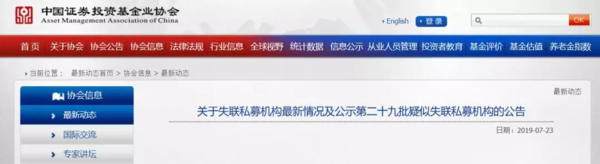 截至2019年7月22日,中基協(xié)已將華信君融(北京)資產(chǎn)管理有限公司等776家機構列入失聯(lián)公告名單,并在協(xié)會官方網(wǎng)站(www.amac.org.cn)中予以列示。