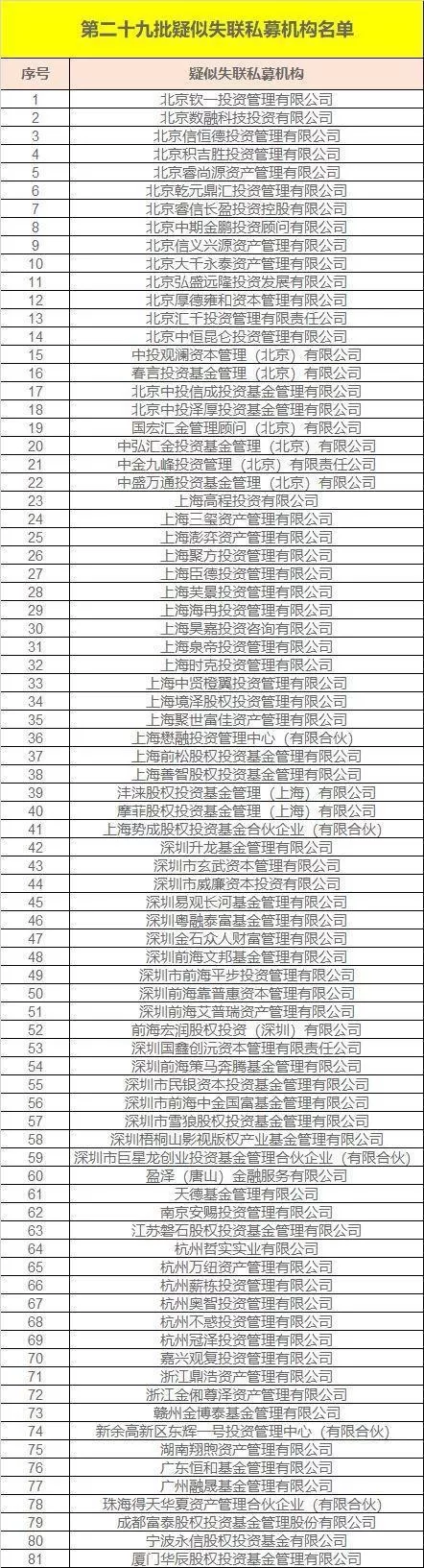 7月23日,中國證券投資基金業(yè)協(xié)會(簡稱“中基協(xié)”)發(fā)布第二十九批疑似失聯(lián)私募機構名單,共涉及北京欽一、上海懋融、深圳升龍、南京安賜等81家公司。