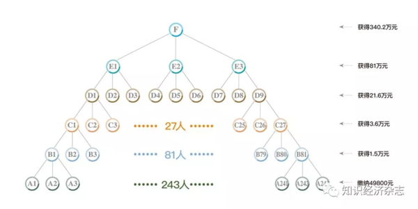 B層和C層被稱為“保本層”,B層級(jí)每發(fā)展1個(gè)下線(A會(huì)員)可以獲得5000元收入,發(fā)展3名A會(huì)員即為合格;當(dāng)傘下A層成功晉升為B層時(shí),原來(lái)的B層也就相應(yīng)成為C層,C層可以獲得9名新入A會(huì)員每人4000元獎(jiǎng)勵(lì),總計(jì)36000元;D層及以上稱為盈利層,D層可以拿到隔兩代的A層27名會(huì)員的每人8000元獎(jiǎng)勵(lì),總計(jì)21.6萬(wàn)元;E層可以拿隔三代的81名A層會(huì)員每人10000元的獎(jiǎng)勵(lì),總計(jì)81萬(wàn)元;F層可以獲得隔四代的243名A層會(huì)員每人14000元獎(jiǎng)勵(lì),總計(jì)340.2萬(wàn)元。