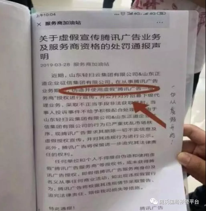 輕掃云偽造"騰訊服務商"授權進行虛假宣傳 涉嫌非法集資遭遇上門維權