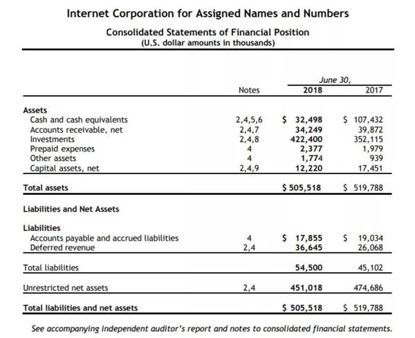 圖:ICANN2018財年合并財務(wù)狀況表