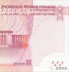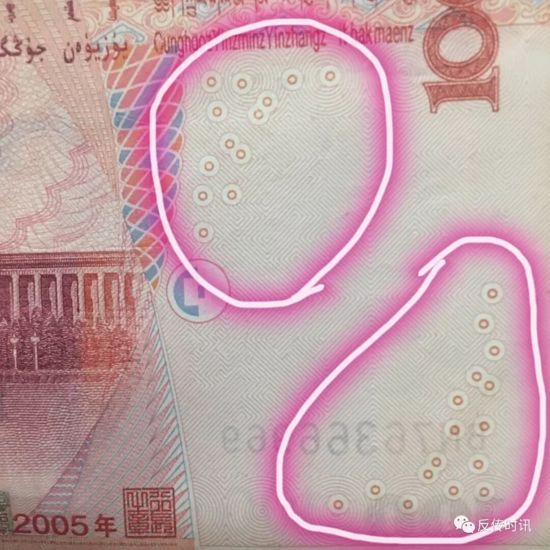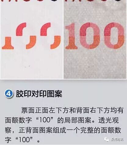 的位置有一塊留白,多出五個顯著的點,在人民幣的另一面也有幾個這樣的點,這就是最新的防偽對印圖案,透光觀察,會發(fā)現(xiàn)正反兩面的點能夠組成一個完整的數(shù)字100圖案。