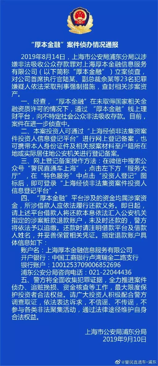 9月10日下午,上海市公安局浦東分局官方微博通報了對“厚本金融”案件的偵辦情況通報。