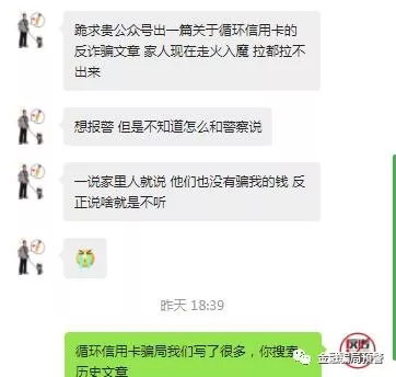 昨天下午,有網(wǎng)友“跪求”我們出一篇關(guān)于循環(huán)信用卡的反詐騙文章。該網(wǎng)友稱,自己的家人現(xiàn)在走火入魔 拉都拉不出來。想報(bào)警,但是不知道怎么和警察說。家里人一勸,他就反駁,他們也沒有騙我的錢,反正說啥就是不聽。