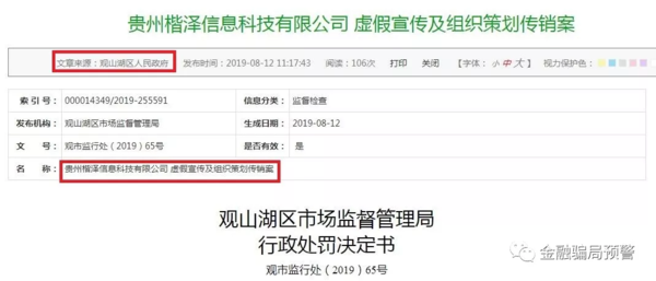 2019年1月28日,貴陽(yáng)市觀山湖市監(jiān)局執(zhí)法人員在一公司住所進(jìn)行檢查時(shí),發(fā)現(xiàn)其辦公場(chǎng)所墻上懸掛 “互聯(lián)網(wǎng)用戶青睞單位”、“年度最具投資價(jià)值企業(yè)”、“2016年度中國(guó)軟件行業(yè)領(lǐng)導(dǎo)企業(yè)獎(jiǎng)”、“網(wǎng)絡(luò)信息安全管理研究?jī)?yōu)秀企業(yè)”、“互聯(lián)網(wǎng)誠(chéng)信龍頭單位”、“中國(guó)權(quán)益保障促進(jìn)聯(lián)盟”、“2016年互聯(lián)網(wǎng)安全創(chuàng)新企業(yè)”、“學(xué)雷鋒活動(dòng)站”等眾多榮譽(yù)牌匾的頒發(fā)單位名稱與公章不相符,且該公司無(wú)法提供牌匾證明材料,涉嫌虛假宣傳。 執(zhí)法人員在對(duì)相關(guān)人員進(jìn)行了詢問(wèn)并收集了相關(guān)證據(jù)時(shí),發(fā)現(xiàn)該公司涉嫌傳銷行為。 1月29日,觀山湖市監(jiān)局對(duì)該公司的經(jīng)營(yíng)場(chǎng)所和相關(guān)人員使用的手機(jī)進(jìn)行查封和扣押,并對(duì)該公司涉嫌傳銷和虛假宣傳并案調(diào)查。 該公司在發(fā)展會(huì)員時(shí),要求參與者繳納500元成為一年期的誠(chéng)盾志愿者導(dǎo)師,交納5000元成為終身誠(chéng)盾志愿者導(dǎo)師。成為“志愿者導(dǎo)師”后,就可以獲得購(gòu)物權(quán)益受損時(shí),可啟動(dòng)保函進(jìn)行維權(quán)的權(quán)益。也可通過(guò)發(fā)展下線獲得獎(jiǎng)勵(lì)。 會(huì)員將“誠(chéng)盾保障”直接推薦給他人,就可獲得所交納培訓(xùn)費(fèi)15%的獎(jiǎng)勵(lì),間接分享他人,可獲得所交納培訓(xùn)費(fèi)10%的獎(jiǎng)勵(lì),會(huì)員在購(gòu)物時(shí),還可獲得購(gòu)物金額5%到20%不等的折扣。 除了以上獎(jiǎng)勵(lì)外,會(huì)員還可以分享“誠(chéng)盾用戶交易保障平臺(tái)“軟件自動(dòng)生成的獎(jiǎng)勵(lì),以及獲得公司贈(zèng)送15000元原始股期權(quán)和價(jià)值7660元的禮品。 金融騙局預(yù)警了解到,被觀山湖市監(jiān)局處罰的這家公司名稱叫貴州楷澤公司,該公司在2018年12月25日注冊(cè)成立。貴州楷澤公司另外一個(gè)身份是誠(chéng)盾中聯(lián)(北京)網(wǎng)絡(luò)科技有限公司(以下簡(jiǎn)稱:誠(chéng)盾中聯(lián)公司,另案處理)授權(quán)的西南地區(qū)代理運(yùn)營(yíng)中心。 貴州楷澤公司在誠(chéng)盾中聯(lián)公司的授權(quán)下,使用“誠(chéng)盾用戶交易保障平臺(tái)”(又稱“誠(chéng)盾保障APP”),開(kāi)展誠(chéng)盾保障會(huì)員業(yè)務(wù)的推廣工作。而該“誠(chéng)盾保障APP”的著作權(quán)屬于北京誠(chéng)盾誠(chéng)訊信息技術(shù)有限公司(以下簡(jiǎn)稱:北京誠(chéng)盾公司,另案處理)。
