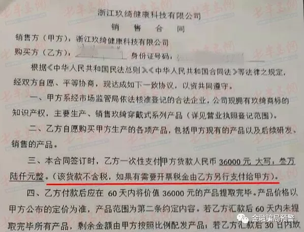 “越深入了解玖綺問題就越多,觸目驚心?!眲⒚劢榻B,玖綺每個代理商大會刷單都能有數(shù)十上百單,年銷售數(shù)億元,但是這些款項都不開發(fā)票。通過另一位代理商孟先生提供的和玖綺簽署的《銷售合同》記者看到,第三條中雙方約定“本合同簽訂時,乙方(代理商)一次性支付3.6萬元,該貨款不含稅,如果有需要開票,稅金由乙方另行支付?!辈稍L中,多位代理商均反映,玖綺從來沒有主動開過發(fā)票,一些現(xiàn)場刷單的代理商,玖綺只會提供一張收據(jù)?!坝械拇砩态F(xiàn)場刷單幾十上百外,款項全部打到公司楊子輝的個人戶頭上?!泵舷壬榻B,期間涉及的稅款無法想象。