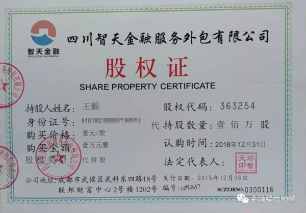 四川智天公司的股權(quán)證 9月初,謝秉丞找到億合科技做統(tǒng)計發(fā)現(xiàn)在共創(chuàng)共享公司賬戶上有約1200萬元,但要退還給投資者的本金約1700萬元,有500萬元缺口。謝秉丞意識到問題嚴重找到華翰公司法人羅某,羅某拿出幾百萬元打到秉承聯(lián)盟公司的對公賬戶。 10月左右,很多投資者到公司來喊退款,謝秉丞又去找羅某,每次羅某都只拿一點錢出來,越拿越少,后來沒有錢了。10月10日,投資者到公司找到毛強要求退款,毛強解釋說:“中鐵華翰集團正在并購秉承聯(lián)盟,退款要90個工作日。”隨后,投資者到公安機關(guān)報案。 10月16日秉承聯(lián)盟公司、華翰科技集團有限公司出具《關(guān)于華翰科技集團并購秉承聯(lián)盟的通知》。該通知書上顯示,“華翰科技集團經(jīng)研究決定,自2017年10月27日起90個工作日內(nèi)秉承聯(lián)盟平臺對并購之前的原始會員訂單及退款業(yè)務未執(zhí)行處理的,華翰科技集團將對用戶負責處理,預計2周內(nèi)完成并購。” 至案發(fā),“共創(chuàng)共享”平臺工涉及投資人9541人,通過“通聯(lián)支付”吸收資金高達1億余元。秉承聯(lián)盟公司轉(zhuǎn)款至共創(chuàng)共享公司9374萬余元、共創(chuàng)共享公司轉(zhuǎn)款至華翰國農(nóng)公司217萬余元,資金缺口高達1300萬元左右。 2018年1月,謝秉丞、毛強接公安機關(guān)電話通知,相繼到案。隨后,謝秉丞、毛強因涉嫌非法吸收公眾存款罪,被成都市公安局高新區(qū)分局刑事拘留。 12月14日,成都高新區(qū)人民檢察院指控謝秉丞、毛強犯非法吸收公眾存款罪,并向高新區(qū)人民法院提起公訴。高新區(qū)人民法院依法組成合議庭,公開開庭審理了此案。 近日,高新區(qū)人民法院依照相關(guān)法律的規(guī)定,以非法吸收公眾存款罪,分別判處謝秉丞、毛強有期徒刑三年六個月,并處罰金十萬元,向社會公眾非法吸收的資金予以繼續(xù)追繳并發(fā)還投資群眾,不足部分責令退賠。投資者的本金尚未歸還的,所收取的回報可折抵本金,不足以全部返還的,按照投資群眾的損失比例進行返還。