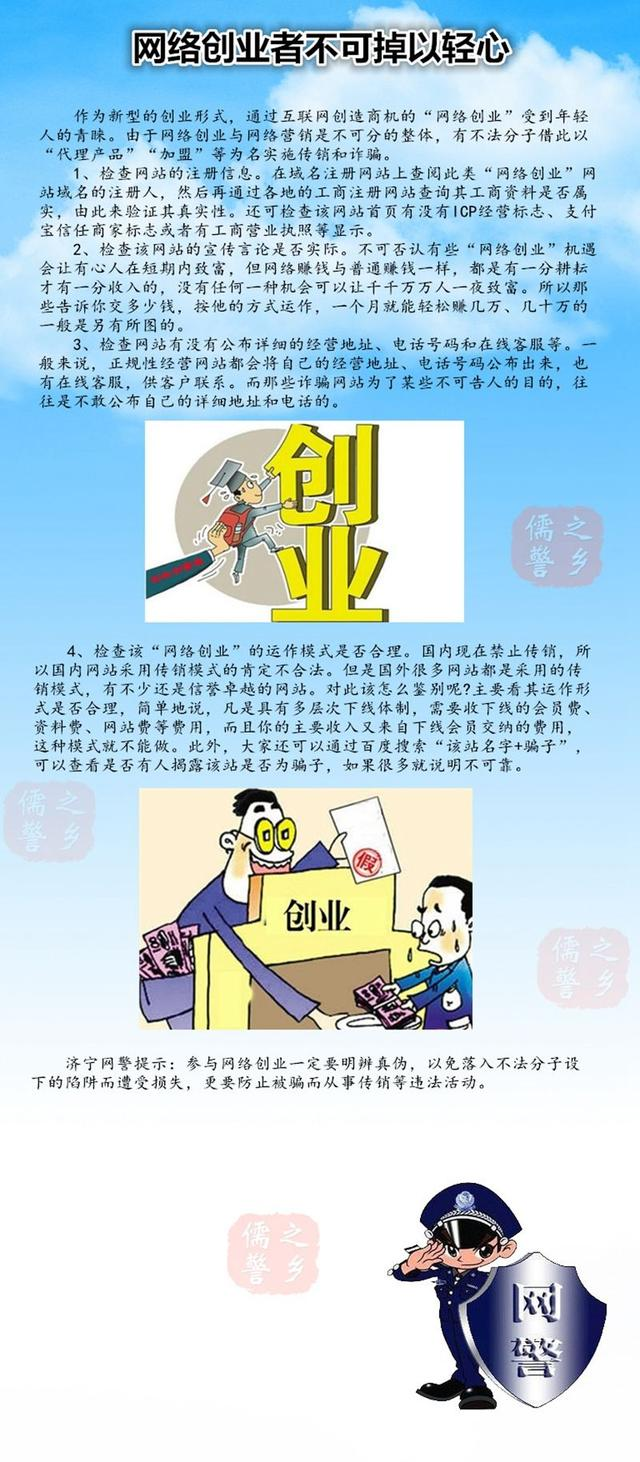 濟(jì)寧網(wǎng)警提示:參與網(wǎng)絡(luò)創(chuàng)業(yè)一定要明辨真?zhèn)?,以免落入不法分子設(shè)下的陷阱而遭受損失,更要防止被騙而從事傳銷等違法活動(dòng)。