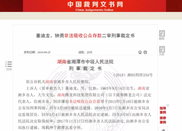 2017年11月15日,湖南省湘鄉(xiāng)市人民法院一審宣判:被告人董迪龍犯非法吸收公眾存款罪、集資詐騙罪,二罪并罰決定執(zhí)行有期徒刑十八年,并處罰金九十萬元。此外,被告人鐘勇、杜祥玉、馮軍港、李慶華犯非法吸收公眾存款罪,分別判處四年六個月至三年三個月不等的有期徒刑,,并處罰金。