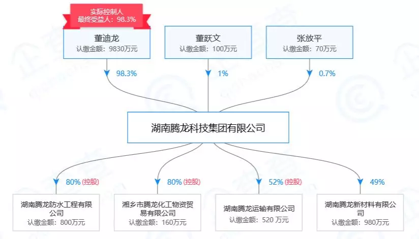 企查查信息顯示,董迪龍是騰龍公司的大股東、法定代表人兼董事長。騰龍公司下設(shè)四家子公司:湖南騰龍防水工程有限公司、湖南騰龍新材料有限公司、湖南騰龍農(nóng)業(yè)開發(fā)有限公司、湖南騰龍化工物資貿(mào)易有限公司。