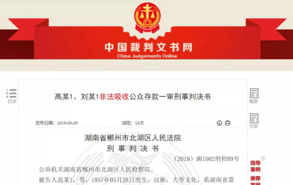 9月26日,湖南郴州市北湖區(qū)人民法院作出一審判決:被告人高某犯非法吸收公眾存款罪,判處有期徒刑二年,緩刑二年,并處罰金三萬元;被告人劉某犯非法吸收公眾存款罪,判處有期徒刑一年,緩刑一年,并處罰金一萬元。