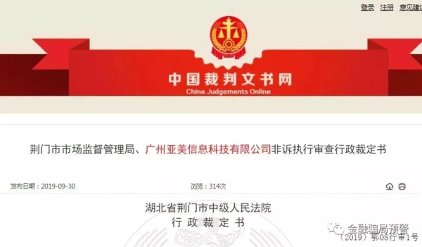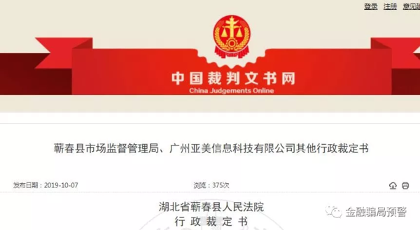 金融騙局預(yù)警還獲悉,10月7日,中國裁判文書網(wǎng)發(fā)布的行政裁定書顯示,廣州亞美信息科技有限公司(以下簡稱:廣州亞美公司)等10家公司在金融機構(gòu)使用的賬戶及在第三方支付平臺使用的帳戶被湖北省蘄春縣人民法院予以凍結(jié)。