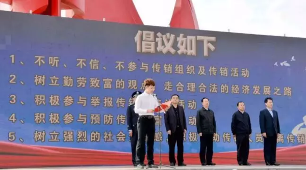 河北建材職業(yè)技術(shù)學(xué)院的60名反傳銷學(xué)生志愿者集體發(fā)出倡議:“不聽、不信、不參與傳銷組織及傳銷活動(dòng);樹立勤勞致富的觀點(diǎn),走合理合法的經(jīng)濟(jì)發(fā)展之路;積極參與舉報(bào)傳銷活動(dòng);積極參與預(yù)防傳銷的宣傳活動(dòng);樹立強(qiáng)烈的社會(huì)責(zé)任感,積極幫助傳銷人員脫離傳銷組織。”
