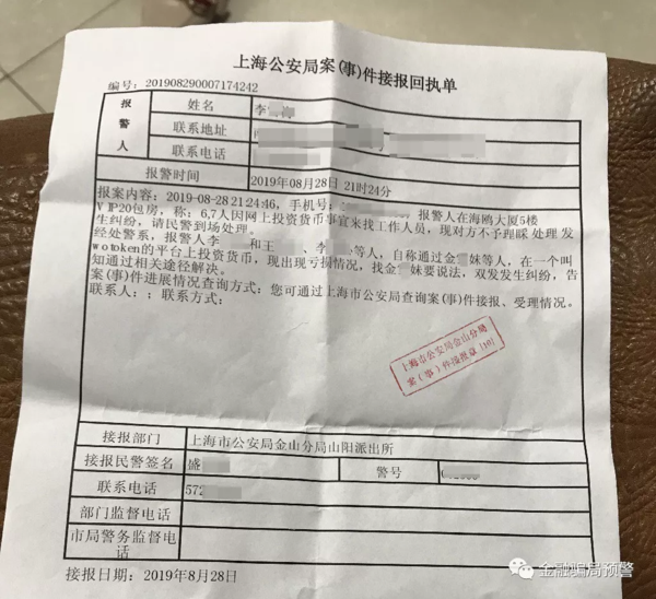 金融騙局預(yù)警在李某、王某等人提供的《上海公安局案件接報回執(zhí)單》上看到,8月28日,李某、王某等人在“WoToken”平臺上投資虛擬貨幣,出現(xiàn)虧損情況,在上海海鷗大廈一包廂內(nèi)找到金某妹要說法。期間雙方發(fā)生糾紛,李某、王某等人于是打110報警。