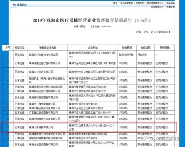 而值得一提的是,在珠海市市場監(jiān)督管理局官網上公布的2019年珠海市醫(yī)療器械經營企業(yè)監(jiān)督檢查結果中,大愛公司就因為有兩項缺陷被責令限期整改。