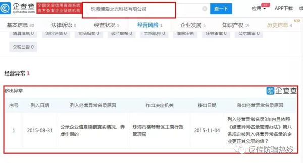 無獨有偶,公司組織架構完全相同的另一家企業(yè),珠海博愛之光科技有限公司于2014年注冊成立。而2015831日就曾因為“公示企業(yè)信息隱藏真實情況、弄虛作假”被珠海市橫琴新區(qū)工商行政管路局列入經營異常名錄名單!