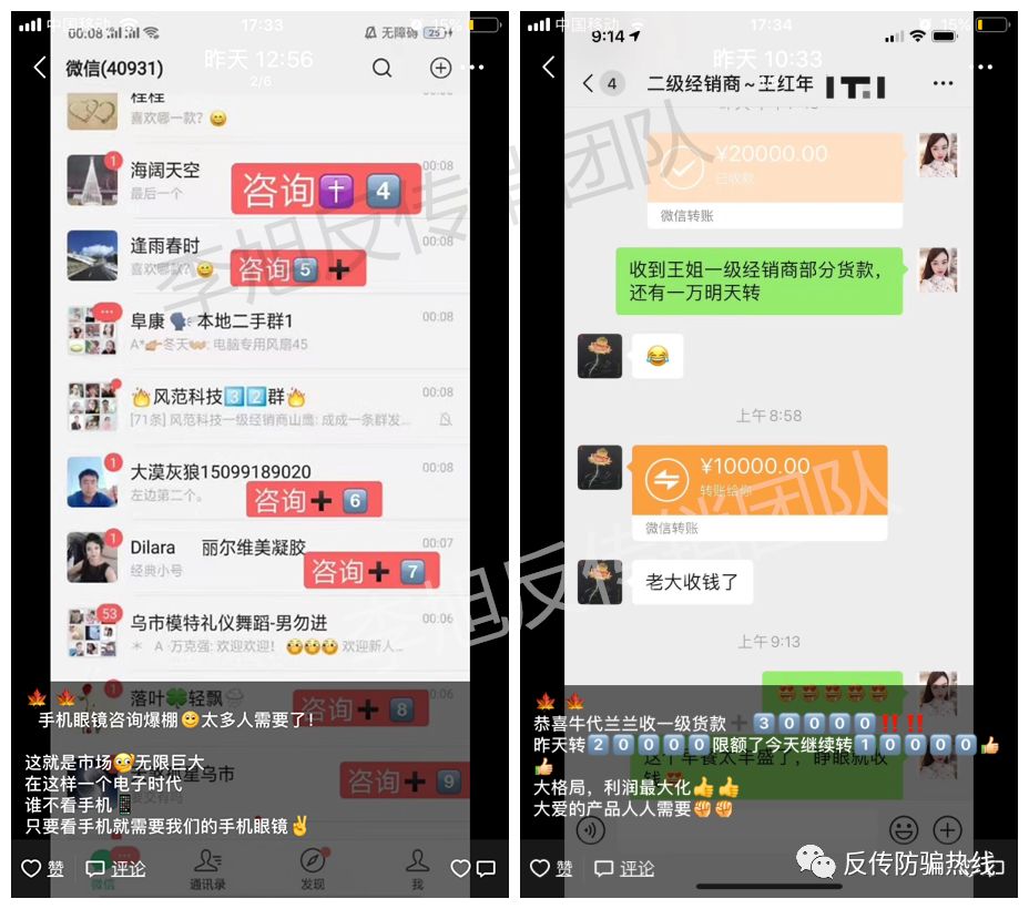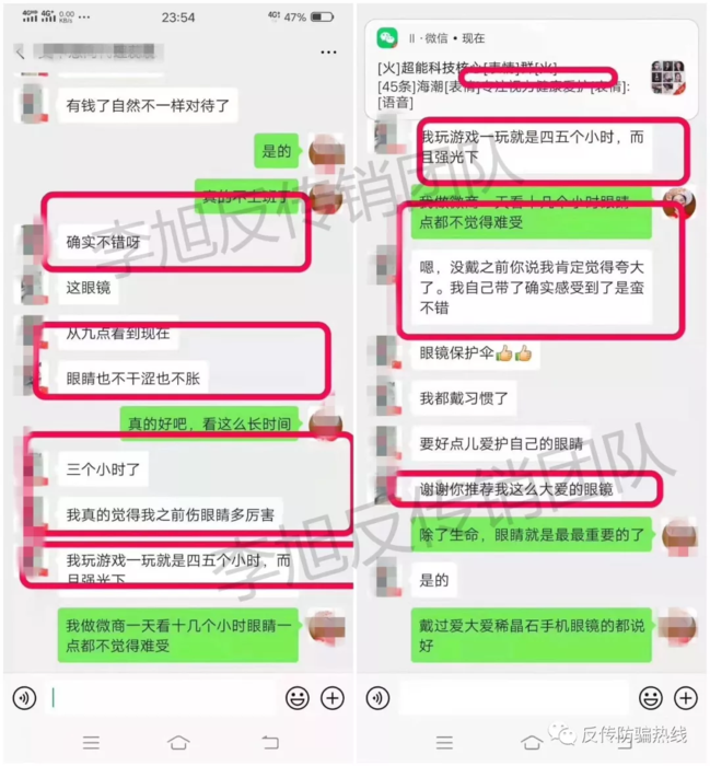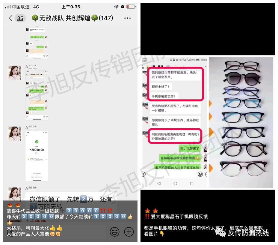 近期,王樂跟李旭反傳銷團隊發(fā)來信息稱,今年上半年,母親突然加入了一個微商團隊,前后投入是十幾萬元代理了一款名為“愛大愛”的眼鏡,他們宣稱:他們的眼鏡對眼干、眼澀、眼疲勞、眼底充血、青光眼效果都非常明顯當天見效。不過模式卻非常像傳銷模式,這究竟是怎么一回事呢?